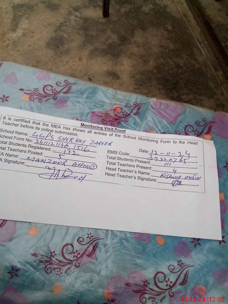| EMIS Code: 39320765 | Name of School: GGPS SHERKAY ZAREEN | |||