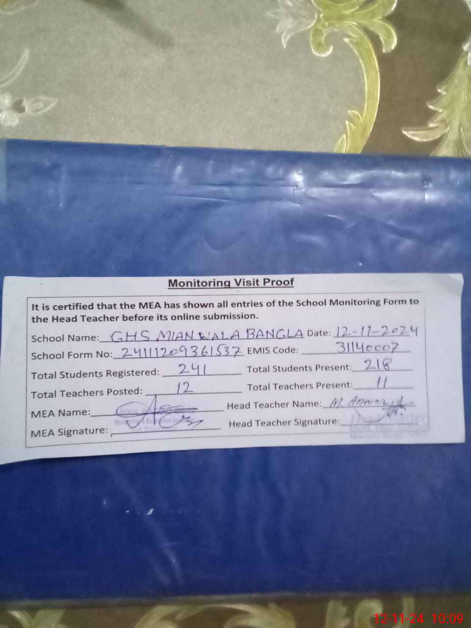 | Attendance Register | Head Teacher | MEA with School | Visit Proof |