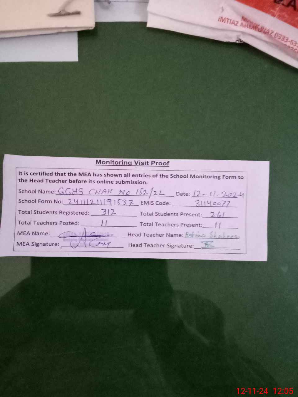 | Attendance Register | Head Teacher | MEA with School | Visit Proof |