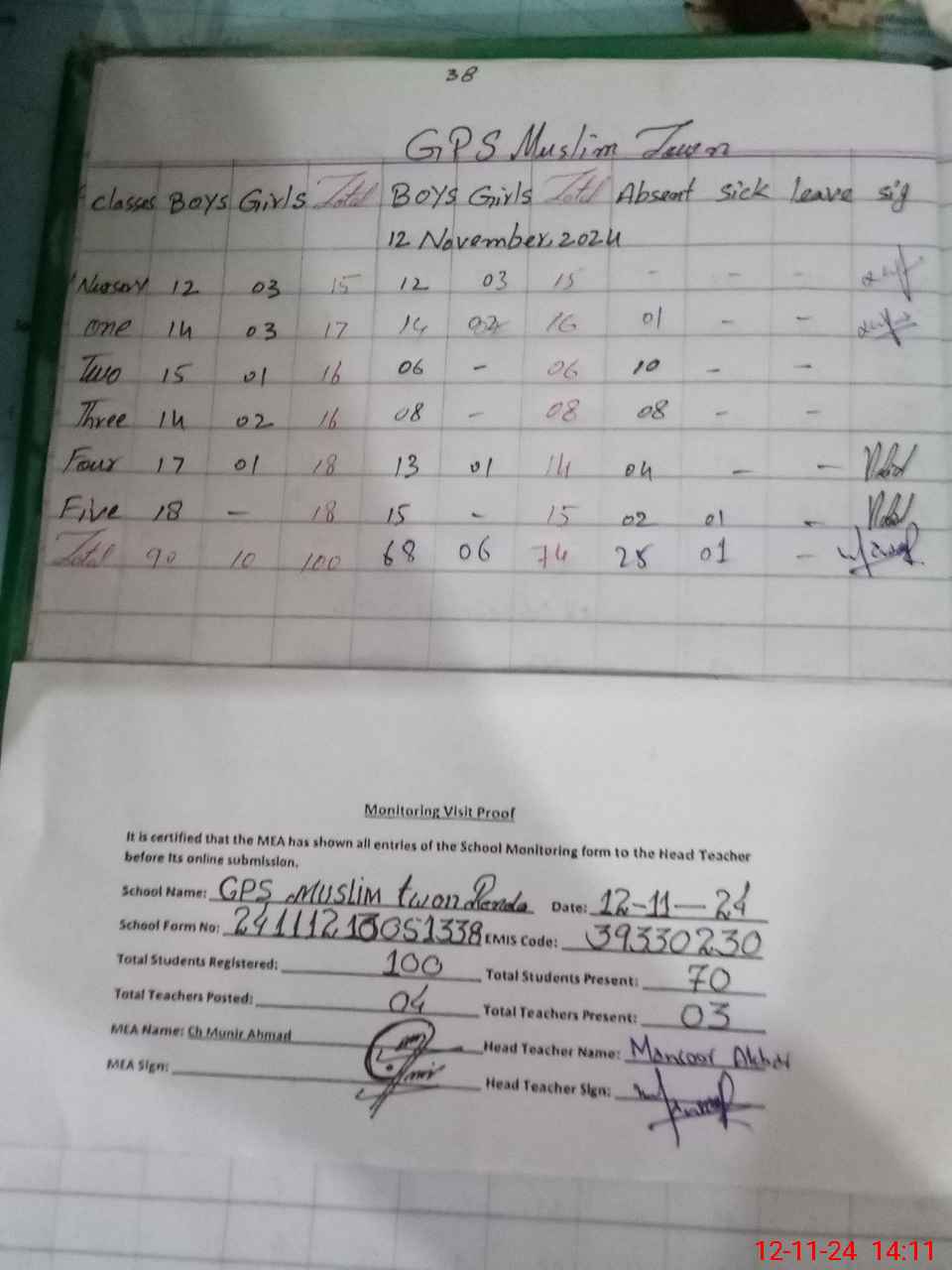| Attendance Register | Head Teacher | MEA with School | Visit Proof |