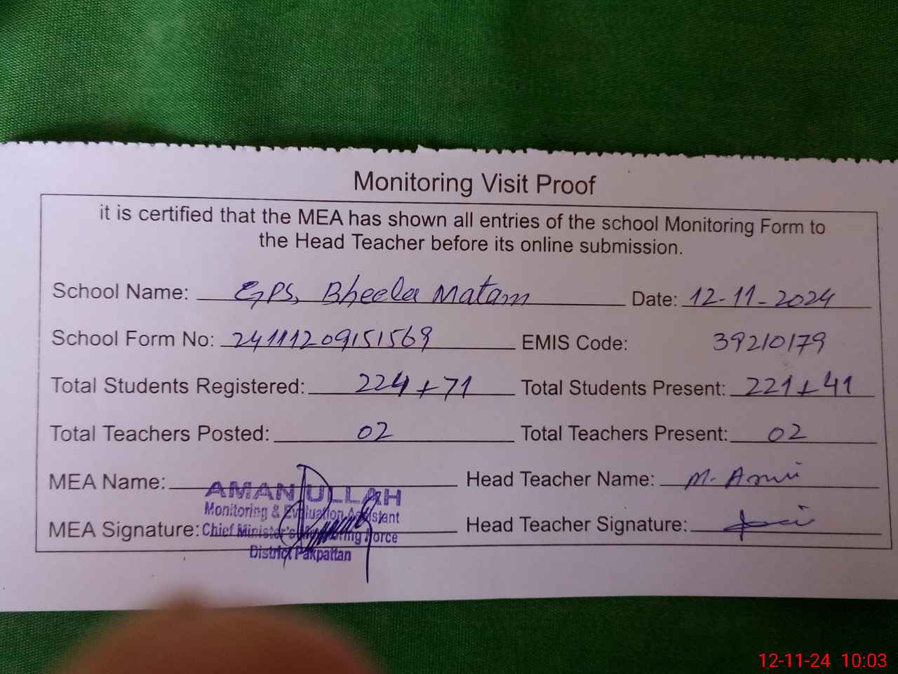 | Monitoring Date: 12-11-2024 | Start Time: 12-11-2024 09:15 AM | End Time: 12-11-2024 10:06 AM | Name of MEA: AM**** UL**** | |