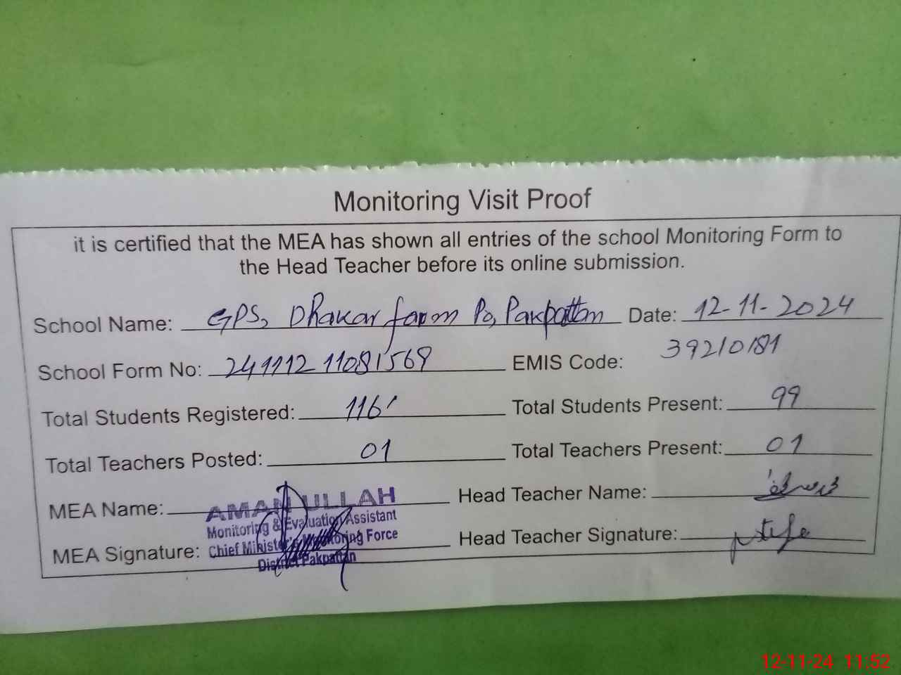 | EMIS Code: 39210181 | Name of School: GPS DHAKAR FARM PO PAKPATTAN | |||