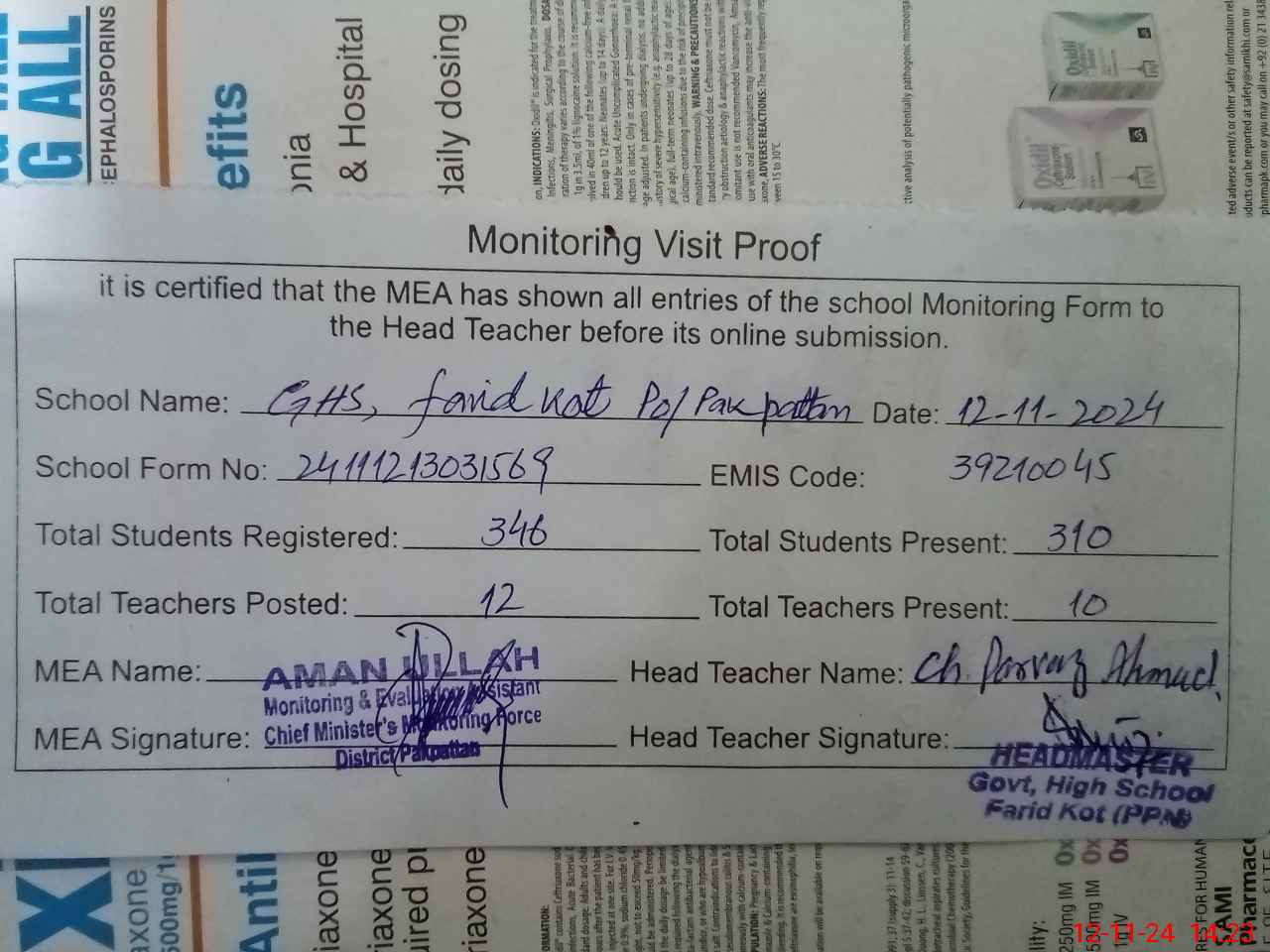 | EMIS Code: 39210045 | Name of School: GHS FARID KOT P/O PAKPATTAN | |||