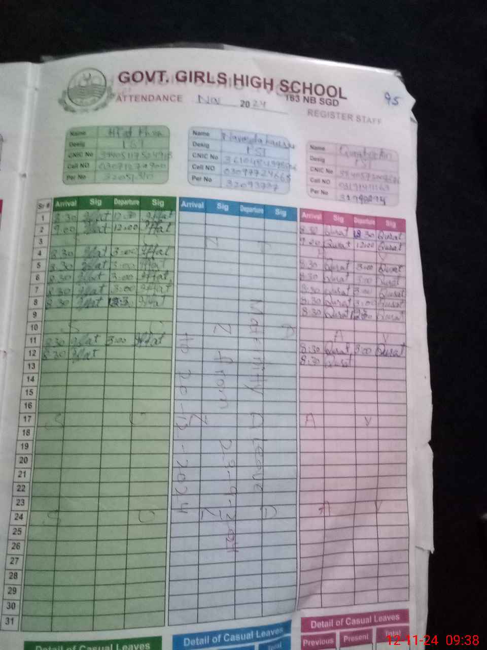 | CNIC | Full Name | Designation | R/C | Absence during last cal. month |