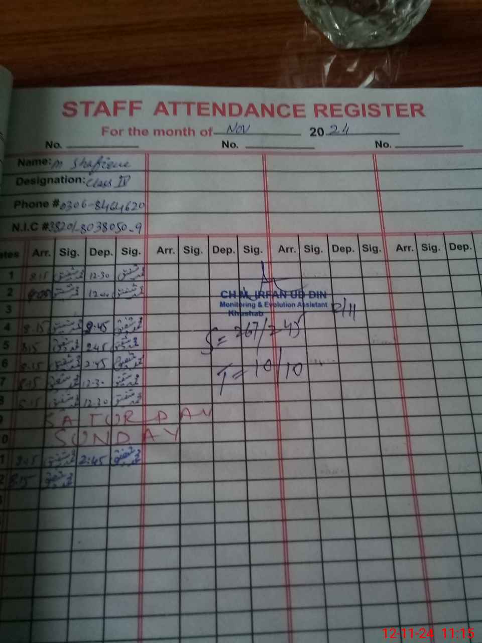 | CNIC | Full Name | Designation | R/C | Absence during last cal. month |