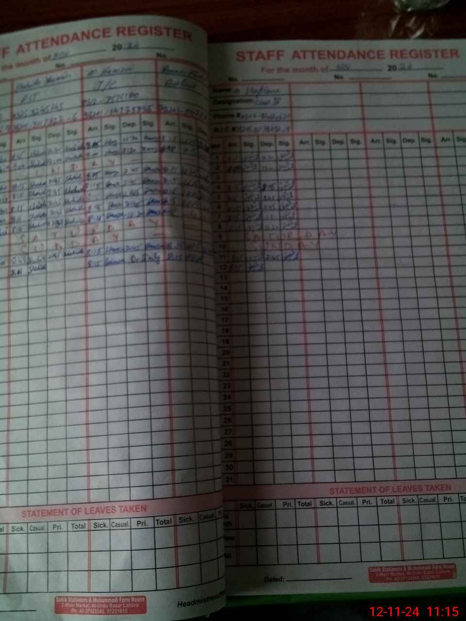| CNIC | Full Name | Designation | R/C | Absence During Last Calender Month |