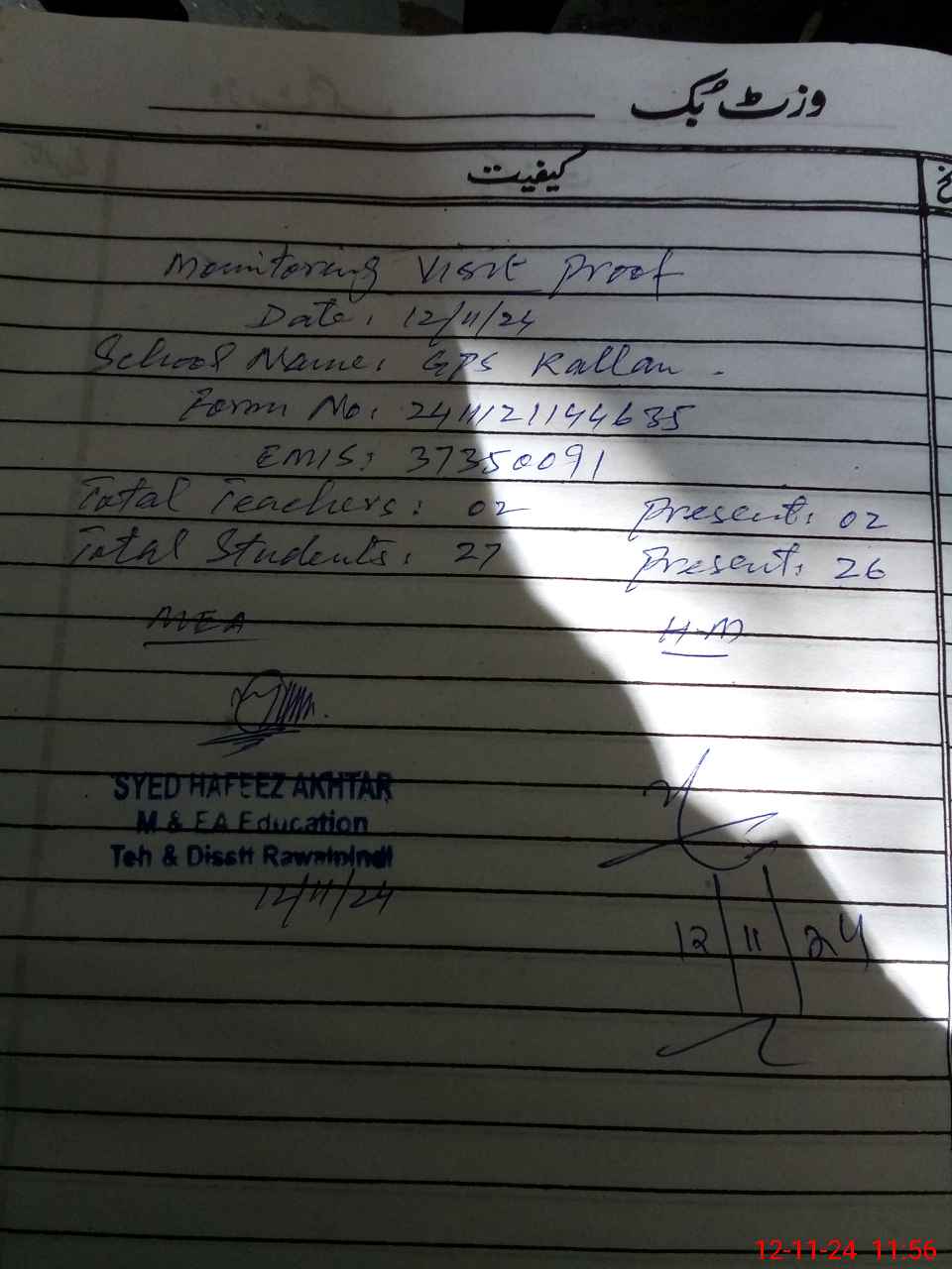 | Monitoring Date: 12-11-2024 | Start Time: 12-11-2024 11:33 AM | End Time: 12-11-2024 11:58 AM | Name of MEA: Sy**** Ha**** Ak**** | |