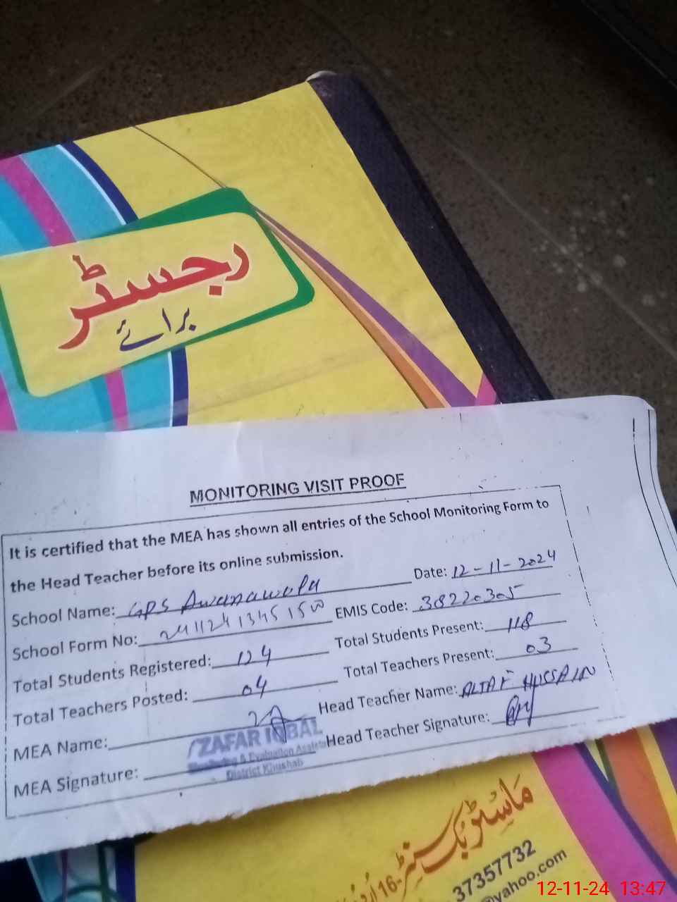 | Attendance Register | Head Teacher | MEA with School | Visit Proof |
