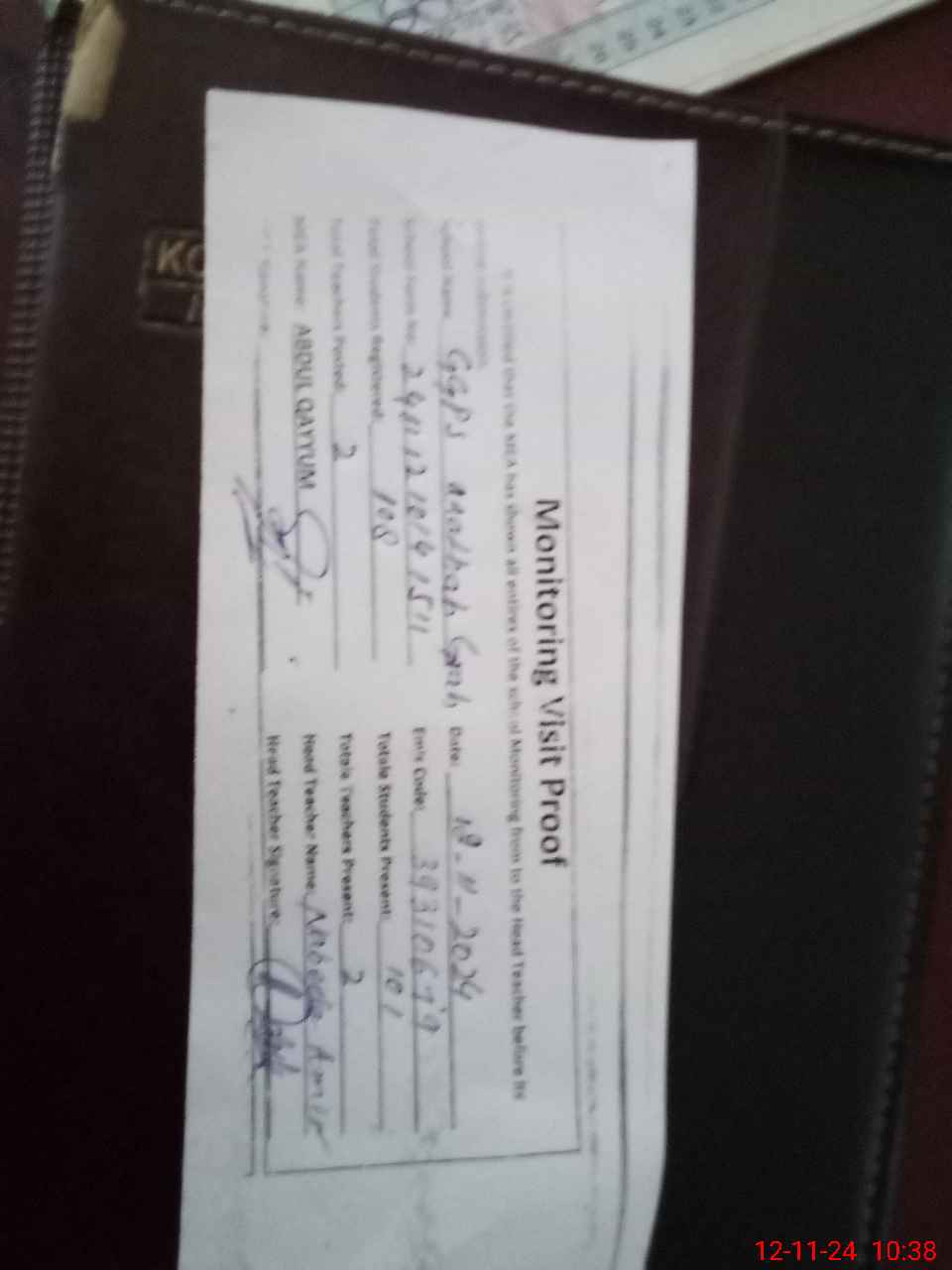 | Attendance Register | Head Teacher | MEA with School | Visit Proof |