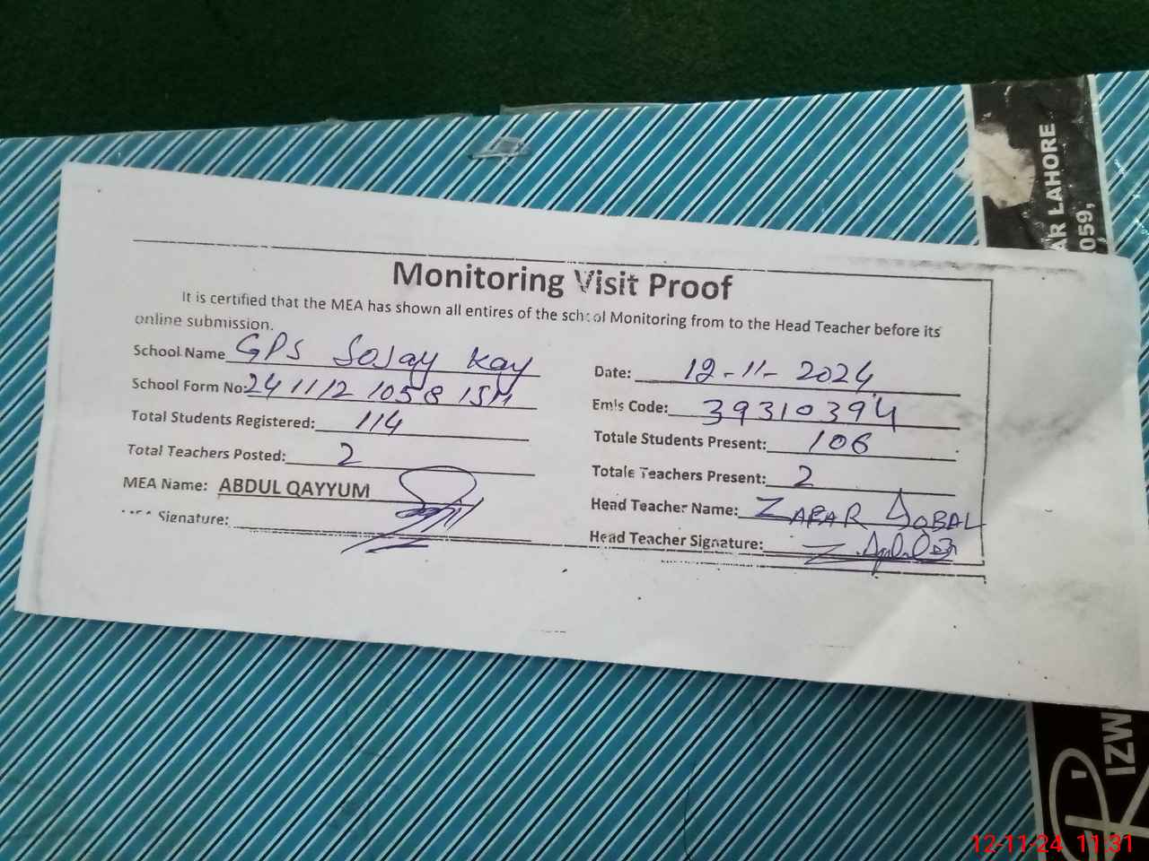 | Attendance Register | Head Teacher | MEA with School | Visit Proof |