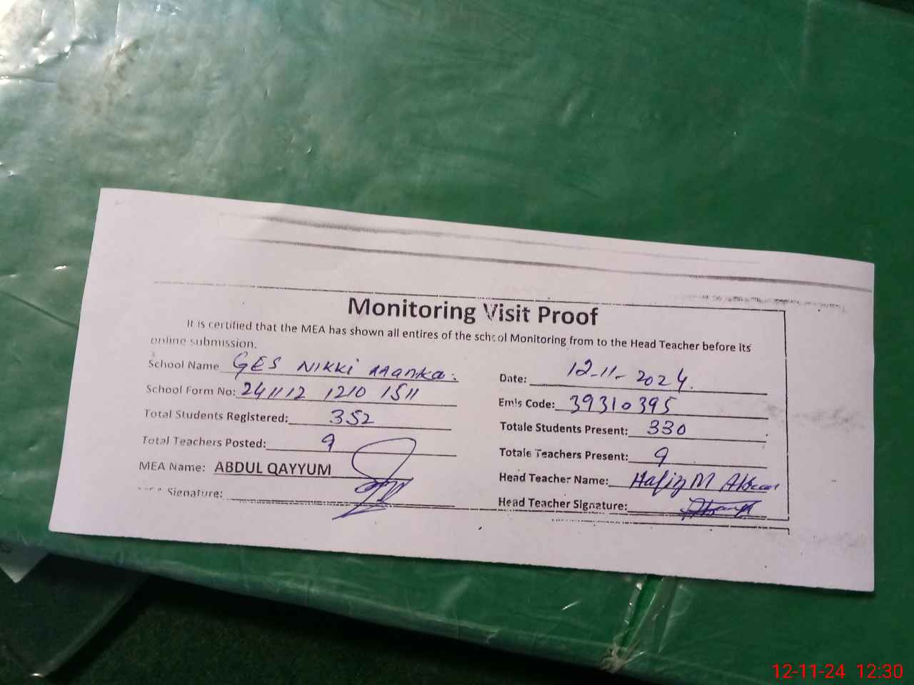 | Attendance Register | Head Teacher | MEA with School | Visit Proof |