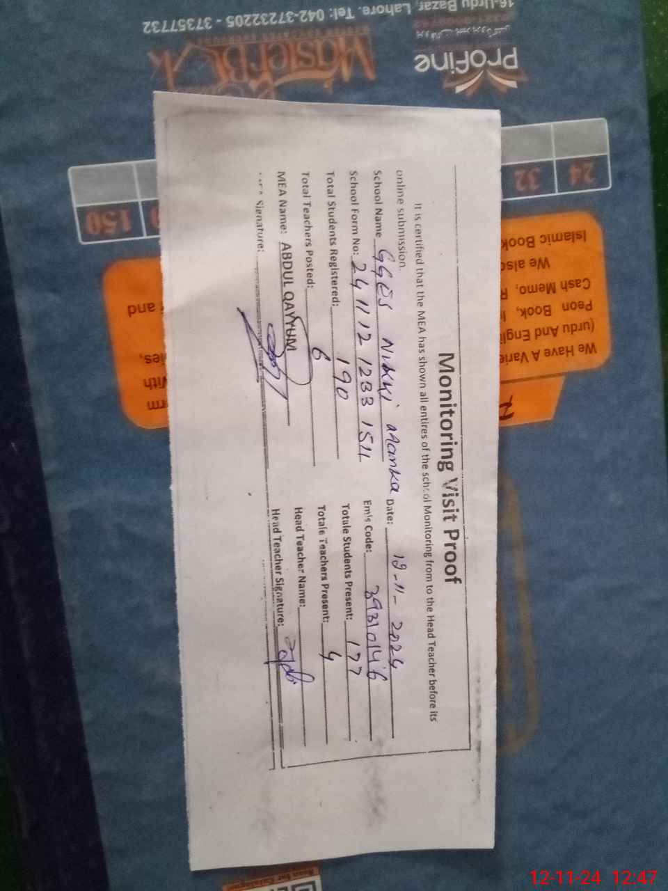 | Attendance Register | Head Teacher | MEA with School | Visit Proof |