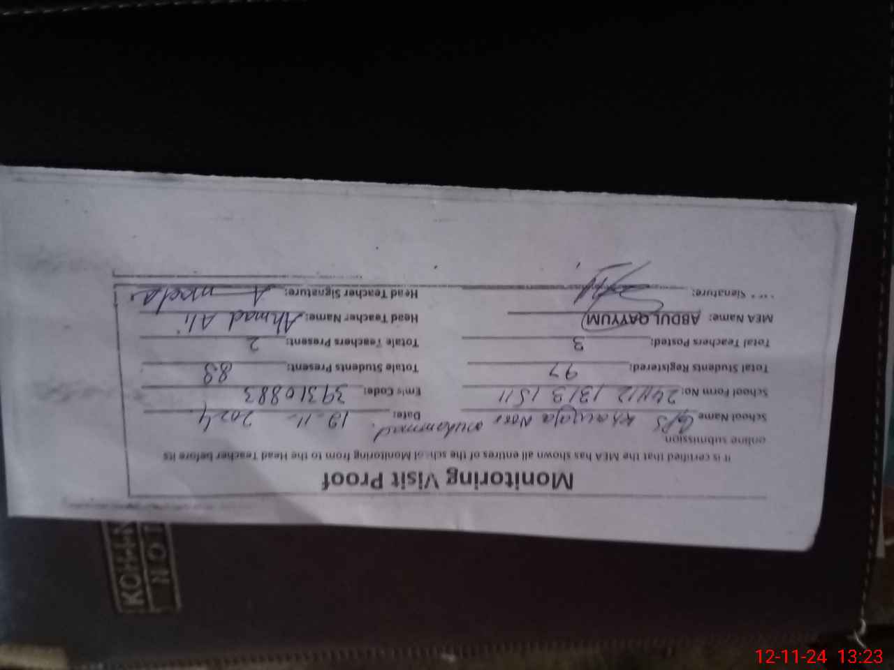 | Attendance Register | Head Teacher | MEA with School | Visit Proof |