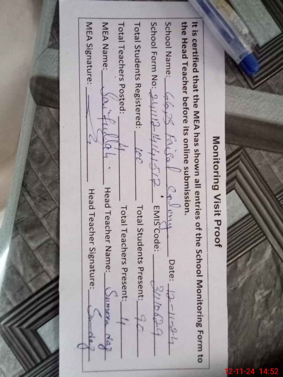 | Attendance Register | Head Teacher | MEA with School | Visit Proof |