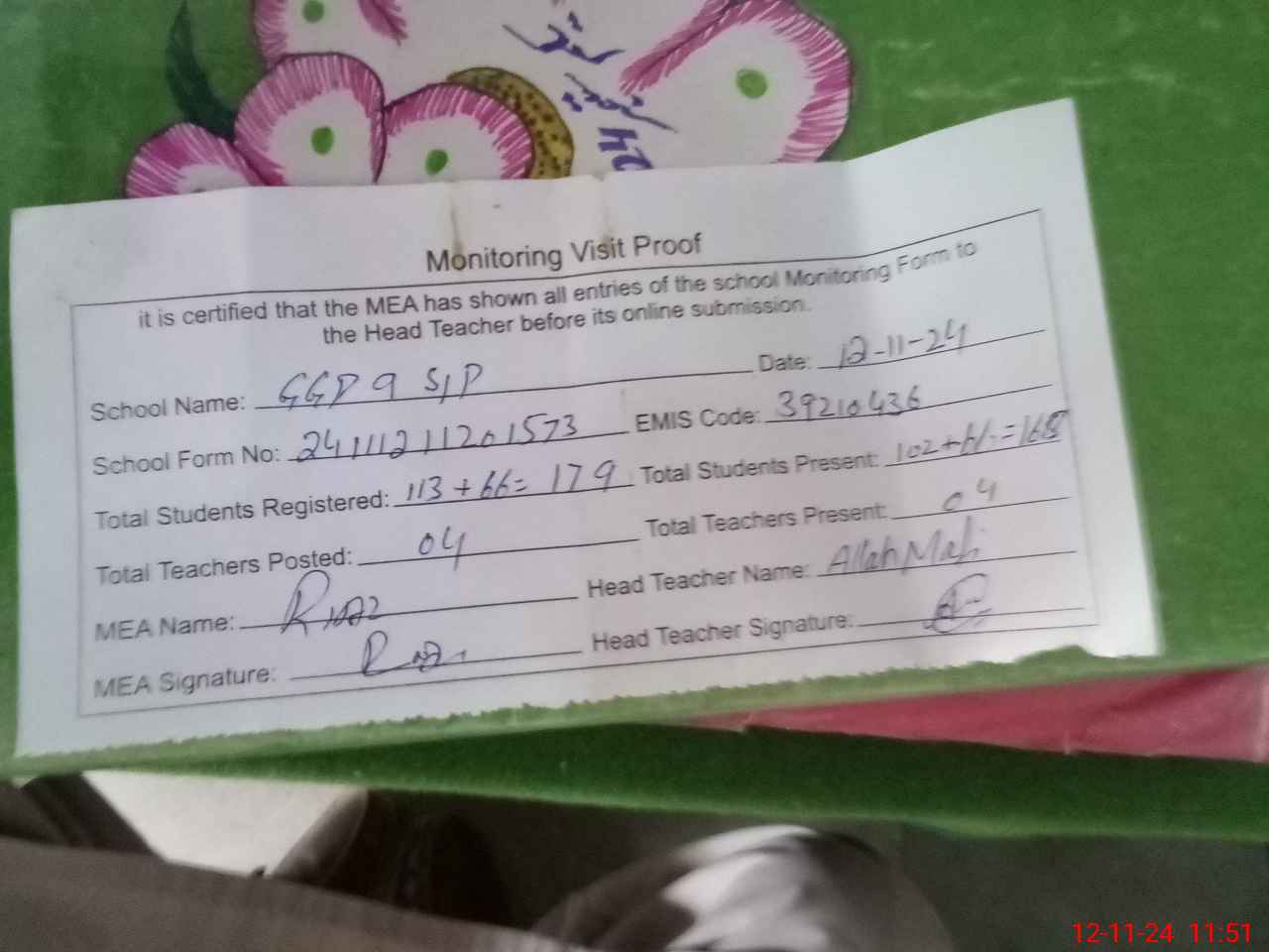 | Attendance Register | Head Teacher | MEA with School | Visit Proof |