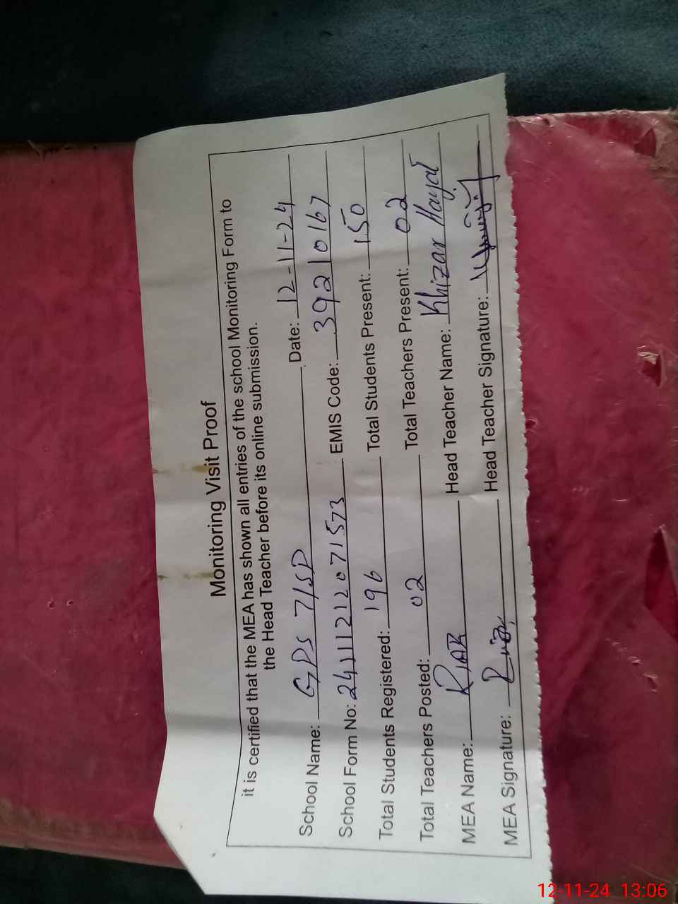 | Attendance Register | Head Teacher | MEA with School | Visit Proof |