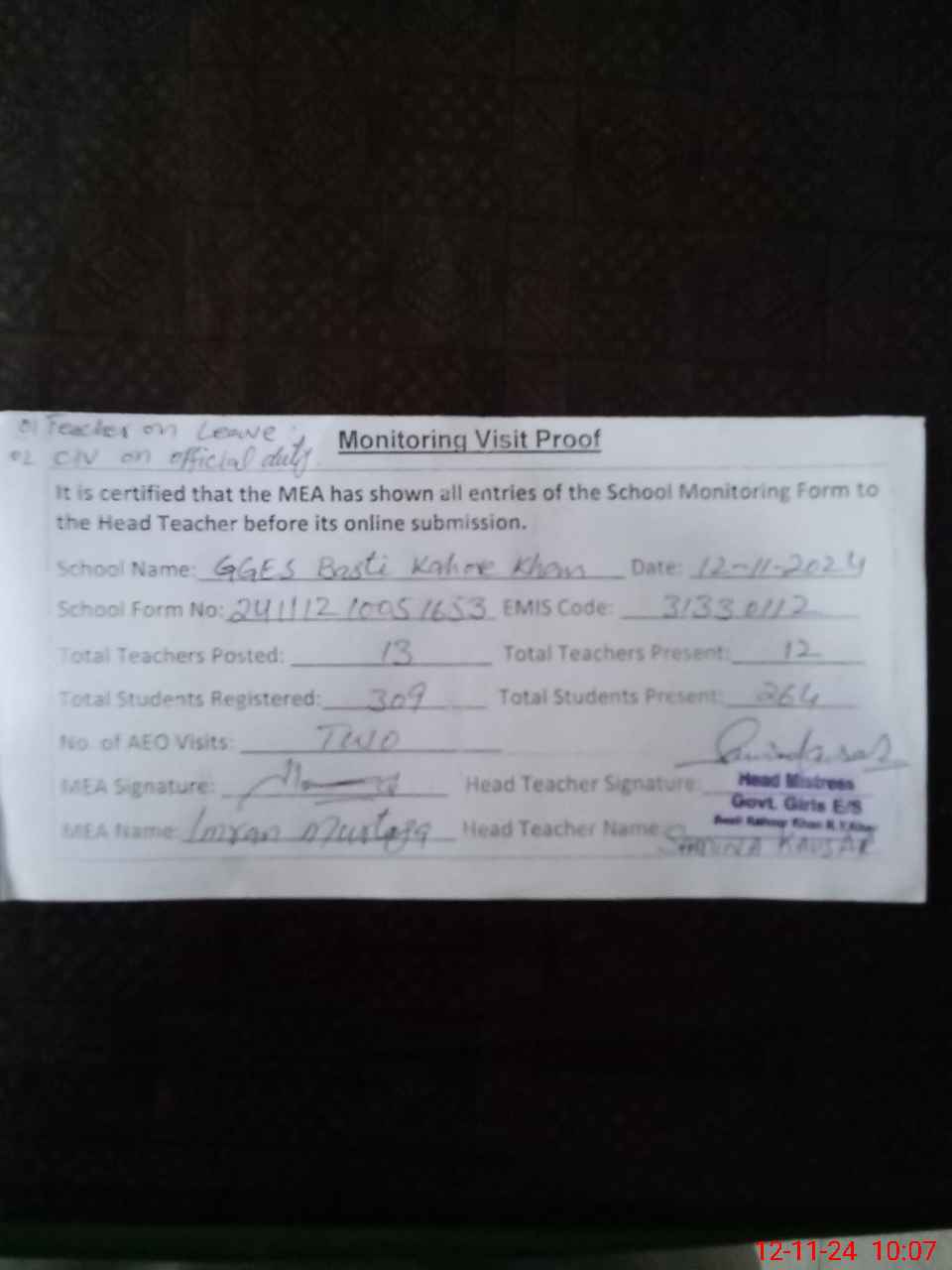 | Attendance Register | Head Teacher | MEA with School | Visit Proof |