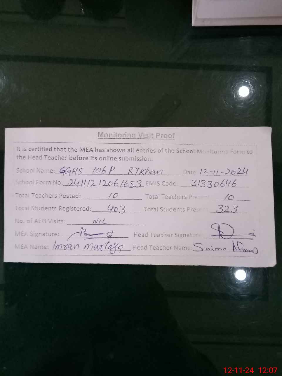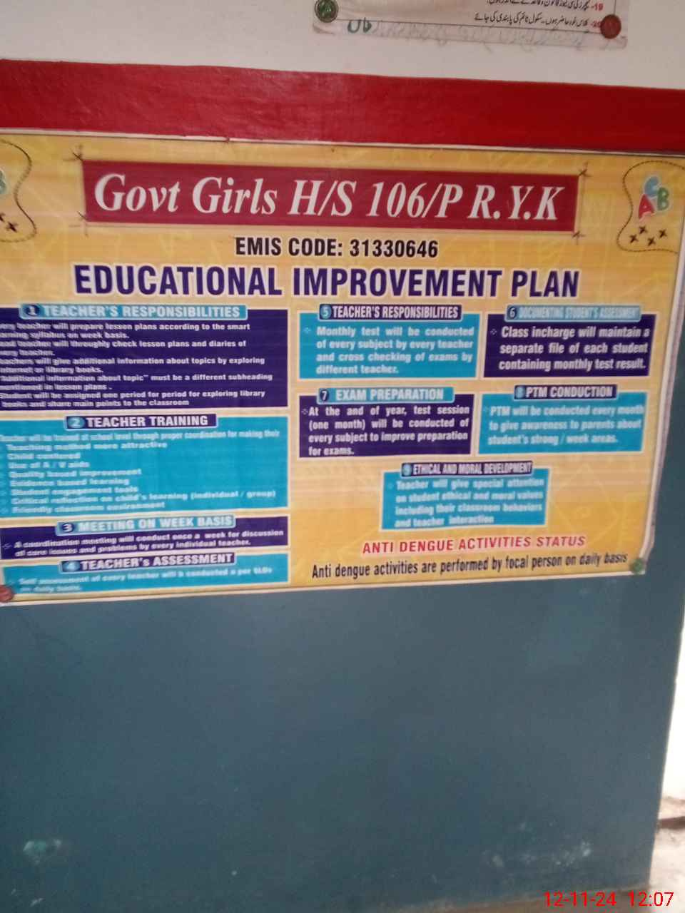 | EMIS Code: 31330646 | Name of School: GGHS 106/P R.Y.KHAN | |||