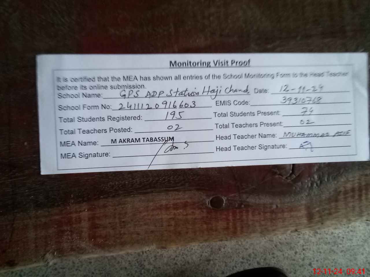 | EMIS Code: 39310768 | Name of School: GPS ADP STATION HAJI CHAND | |||