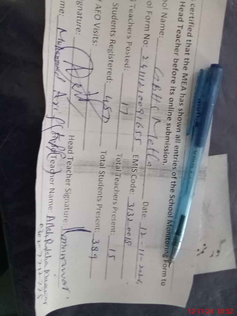 | Name: AL**** RA**** MU**** Designation: (School Headmaster's/Headmistress's) S H M Phone/Cell Number: 03**** |