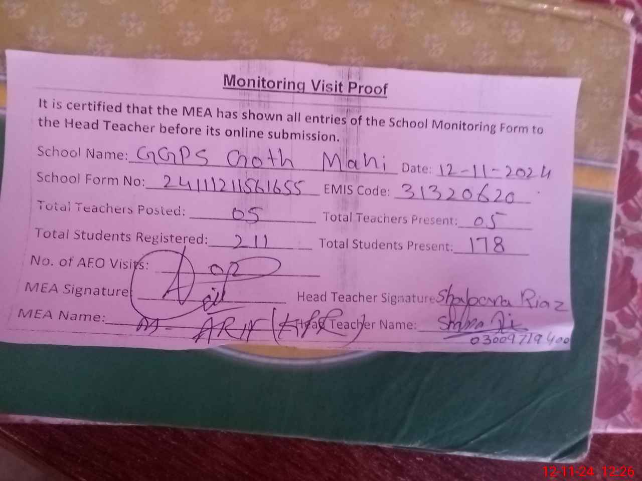 | EMIS Code: 31320620 | Name of School: GGPS GOTH MAHI | |||