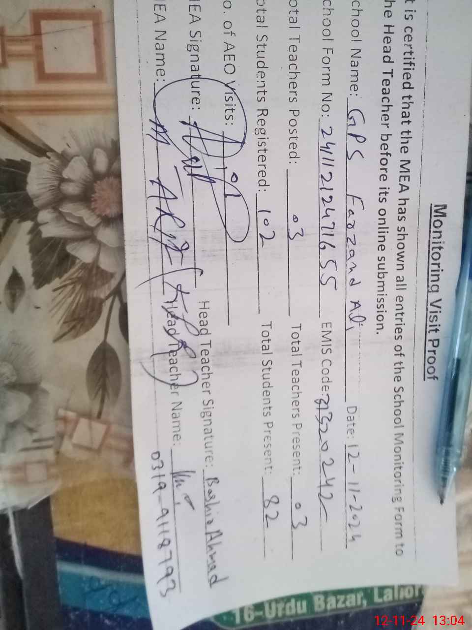 | Attendance Register | Head Teacher | MEA with School | Visit Proof |