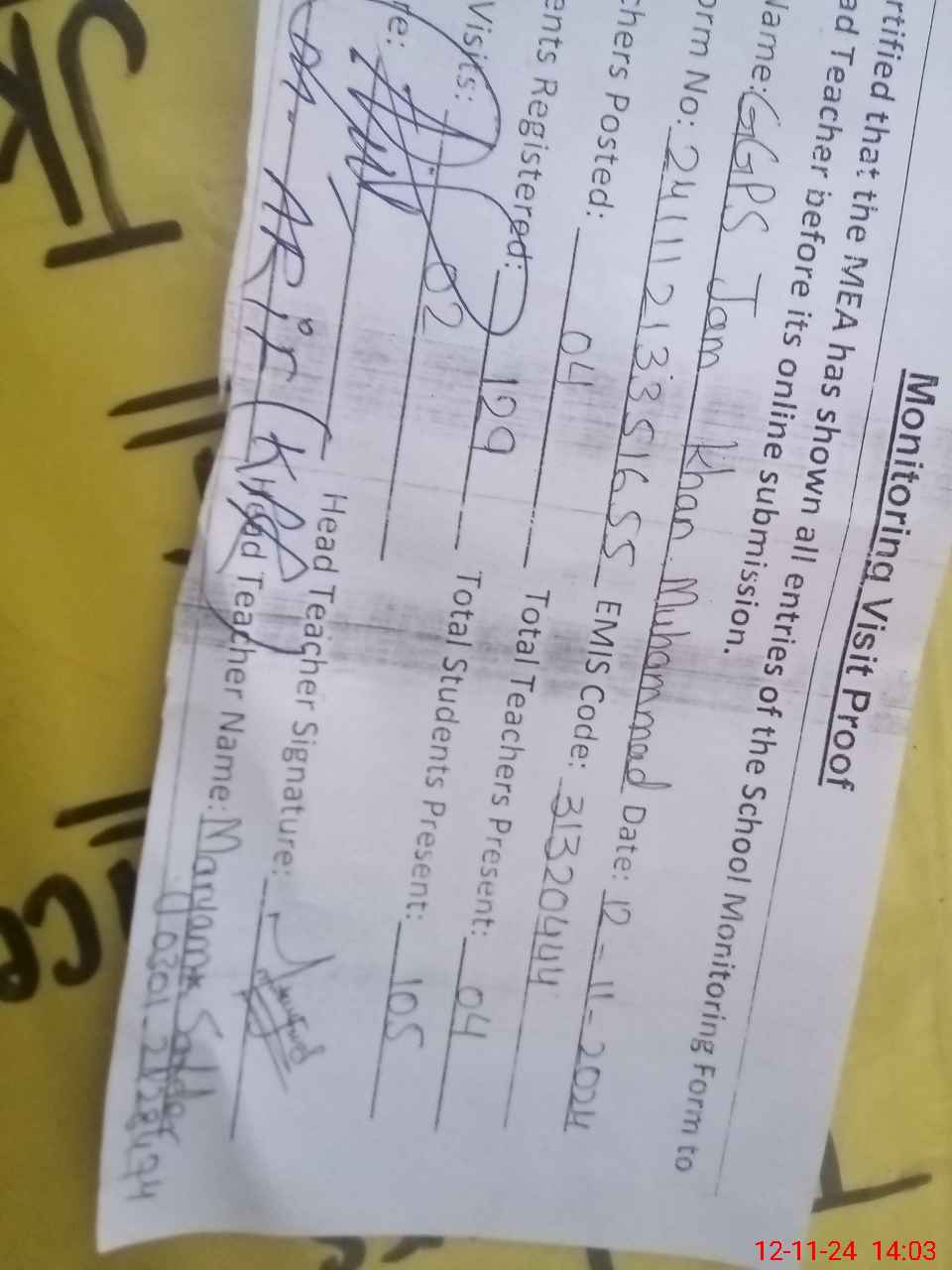 | Attendance Register | Head Teacher | MEA with School | Visit Proof |
