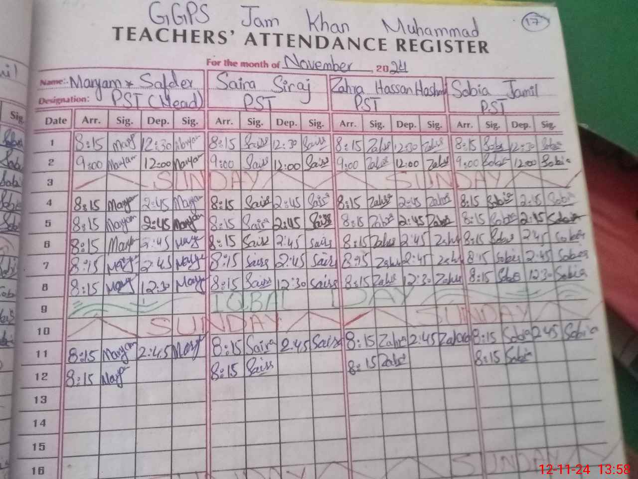 | CNIC | Full Name | Designation | R/C | Absence During Last Calender Month |
