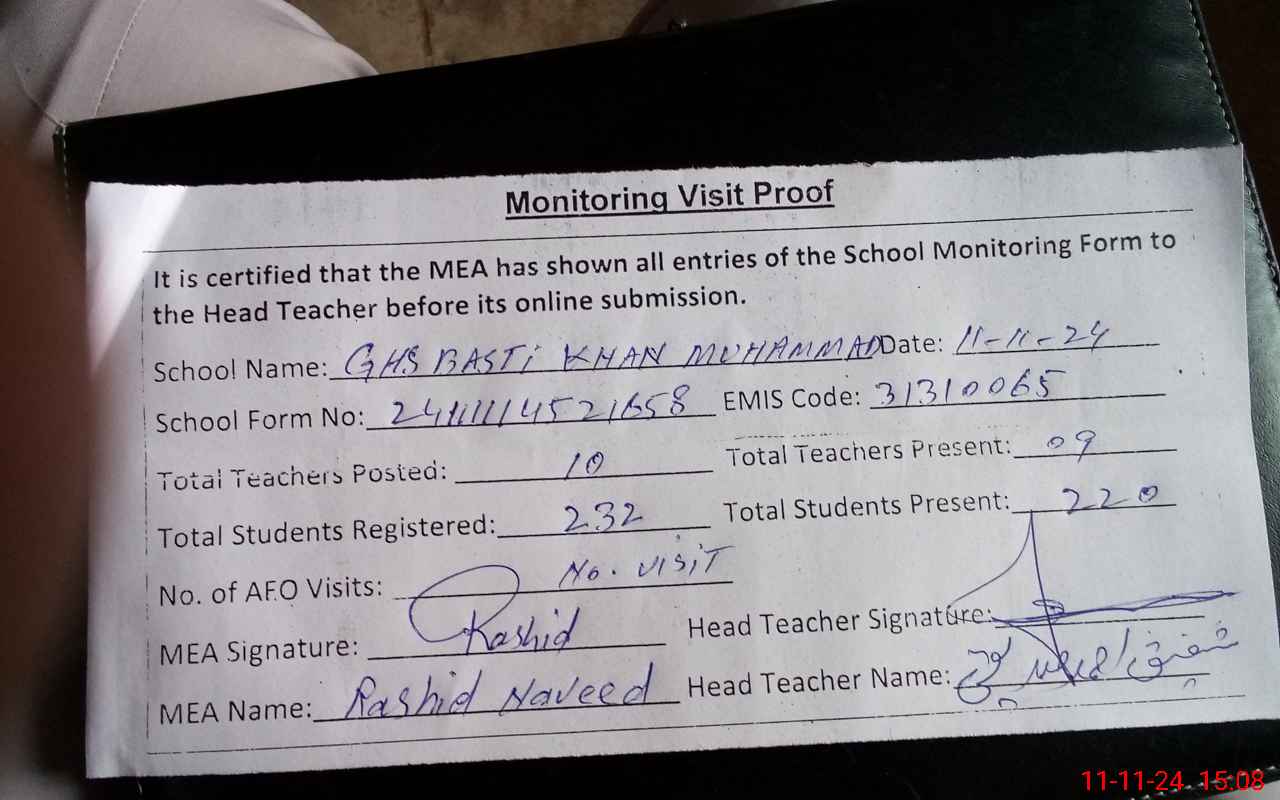| EMIS Code: 31310065 | Name of School: GHS BASTI KHAN MUHAMMAD | |||