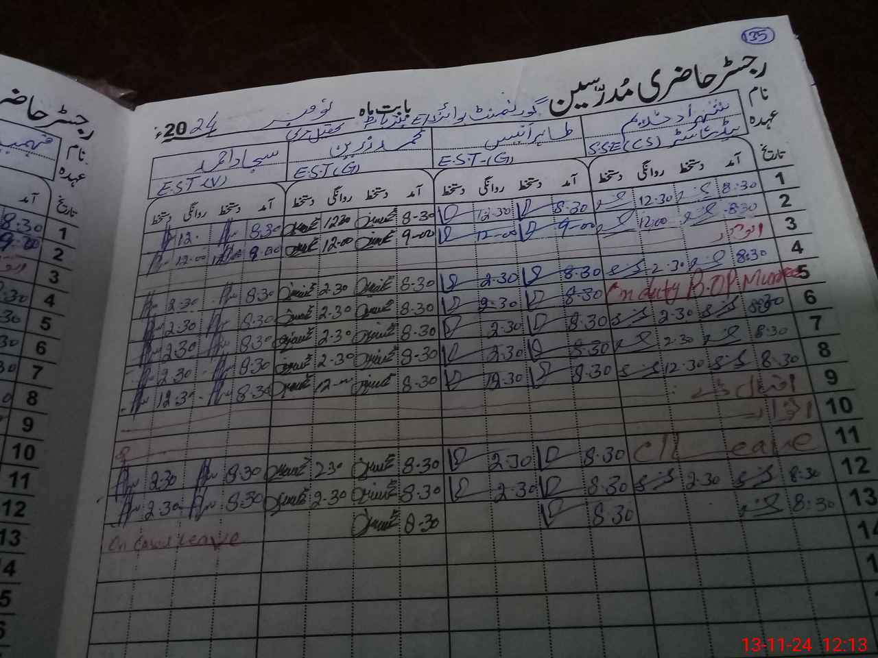 | CNIC | Full Name | Designation | R/C | Absence During Last Calender Month |