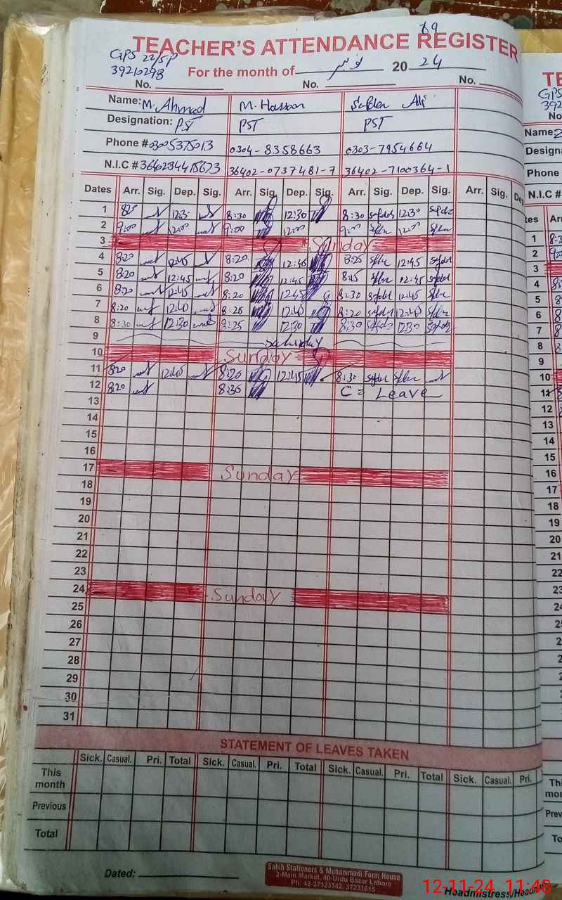 | CNIC | Full Name | Designation | R/C | Absence During Last Calender Month |