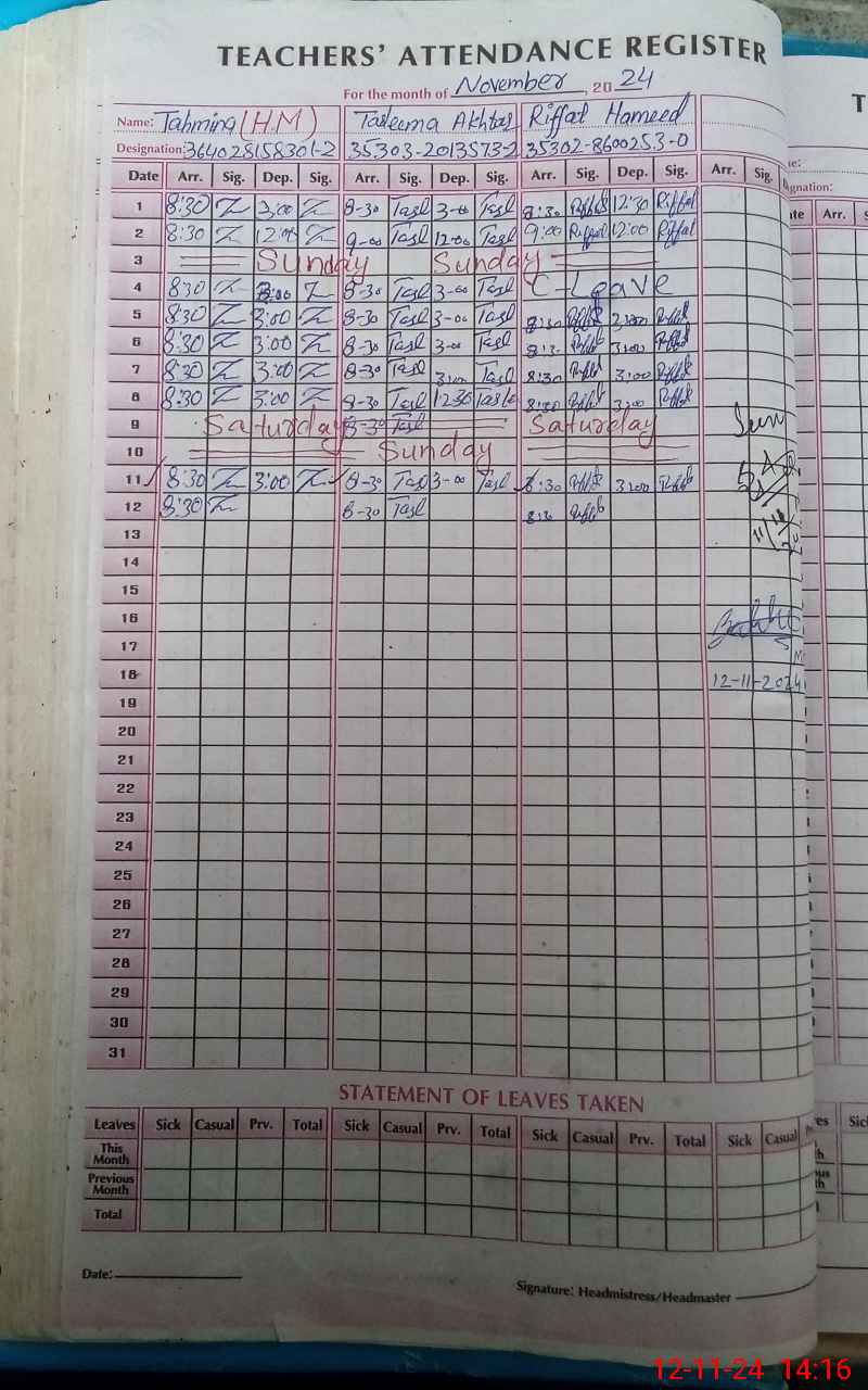 | CNIC | Full Name | Designation | R/C | Absence During Last Calender Month |