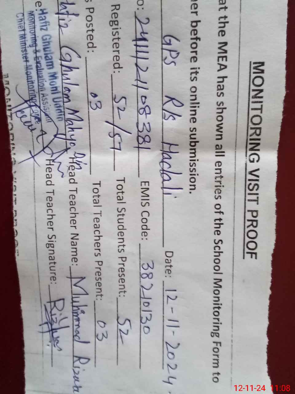 | Attendance Register | Head Teacher | MEA with School | Visit Proof |