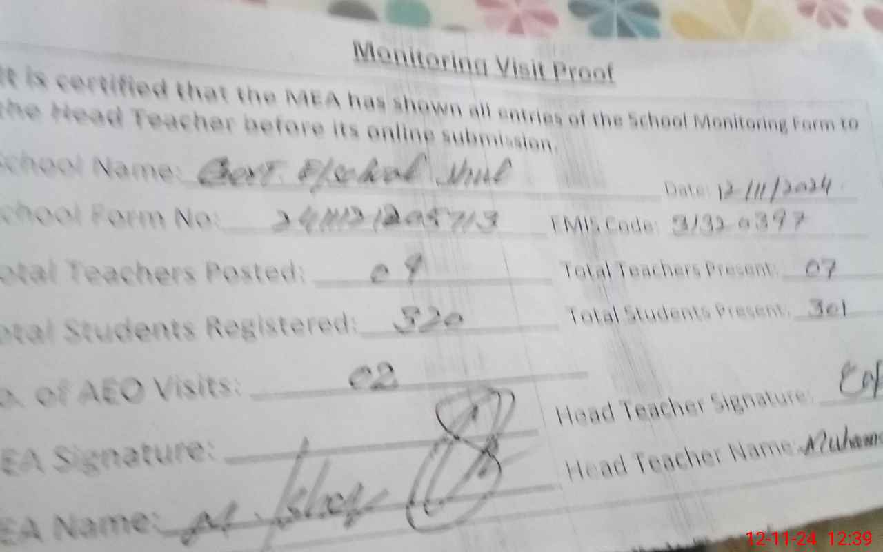 | Attendance Register | Head Teacher | MEA with School | Visit Proof |