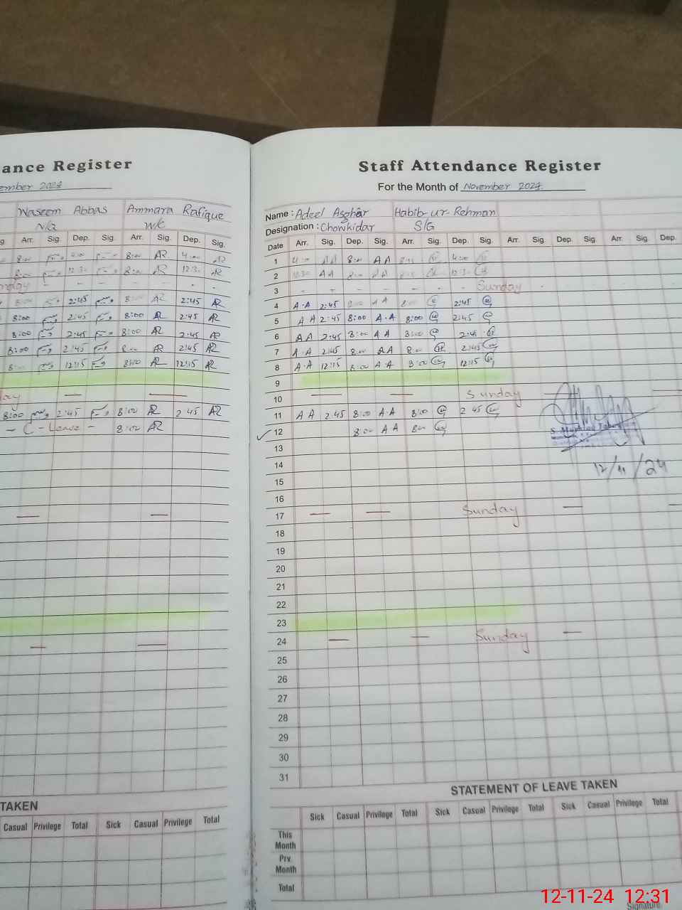 | CNIC | Full Name | Designation | R/C | Absence During Last Calender Month |