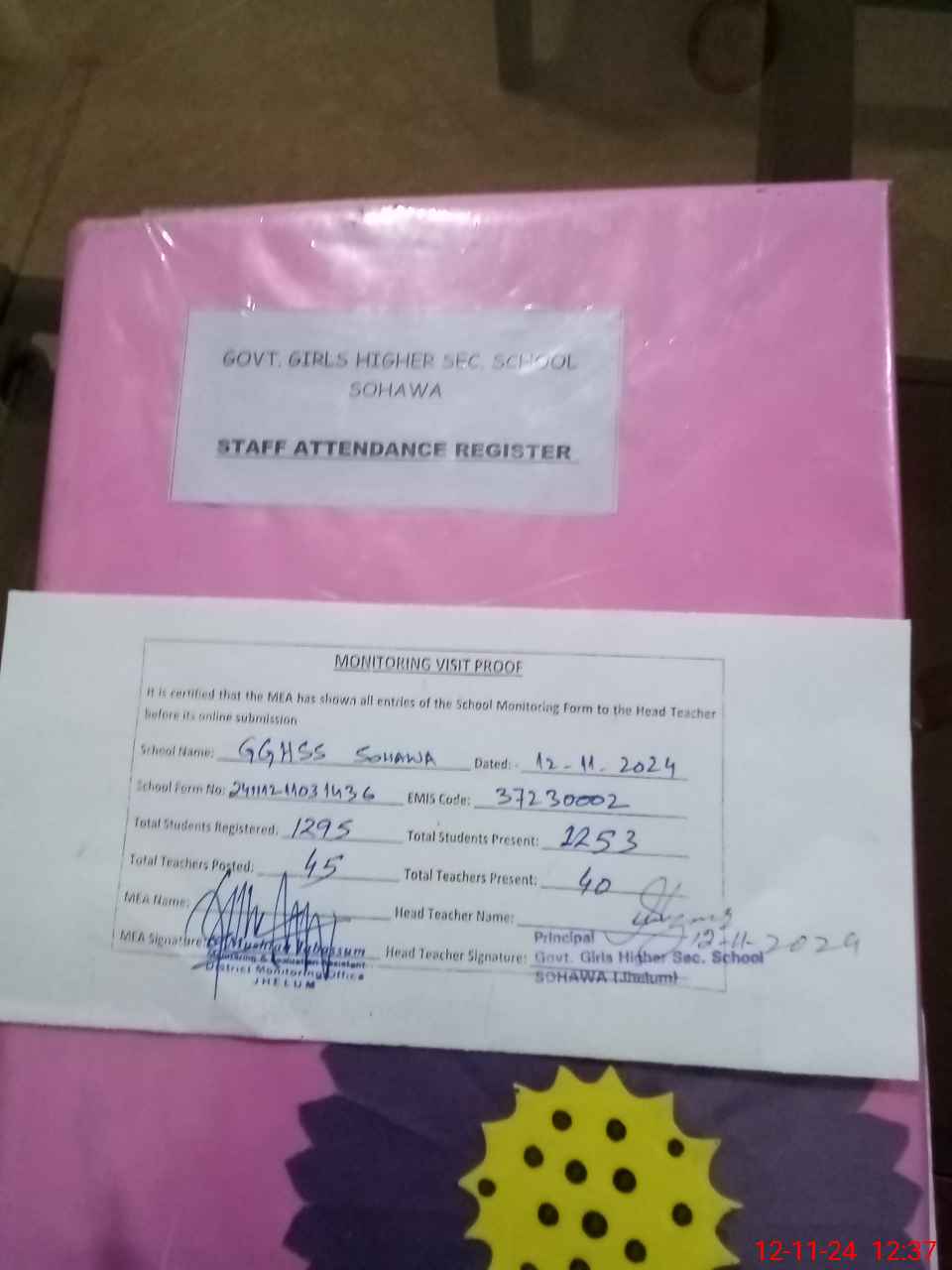 | Attendance Register | Head Teacher | MEA with School | Visit Proof |