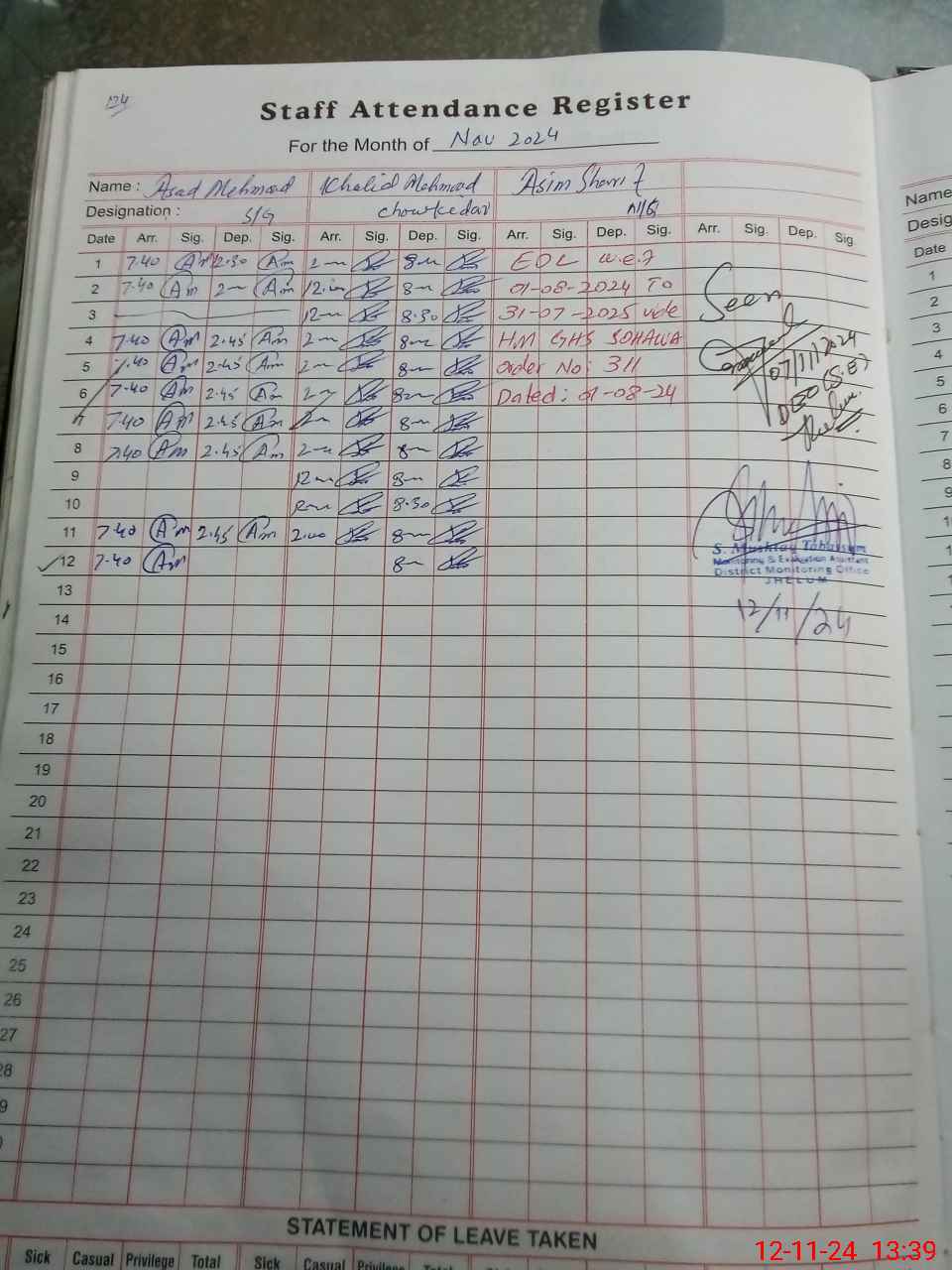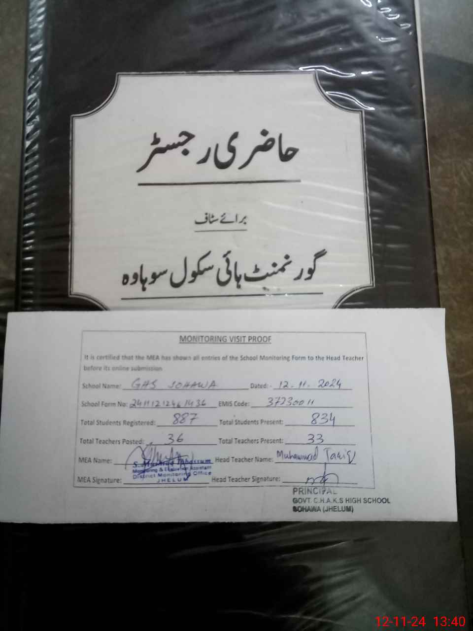 | Remarks (Use Separate Page if Required): Principal Mirza Muhammad Tariq along with Muhammad Ishaque SST is in GHHS Dina for official meeting | |||||