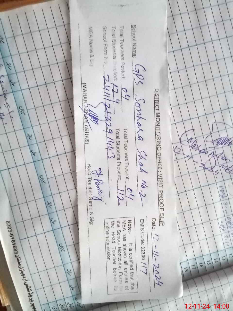 | Attendance Register | Head Teacher | MEA with School | Visit Proof |