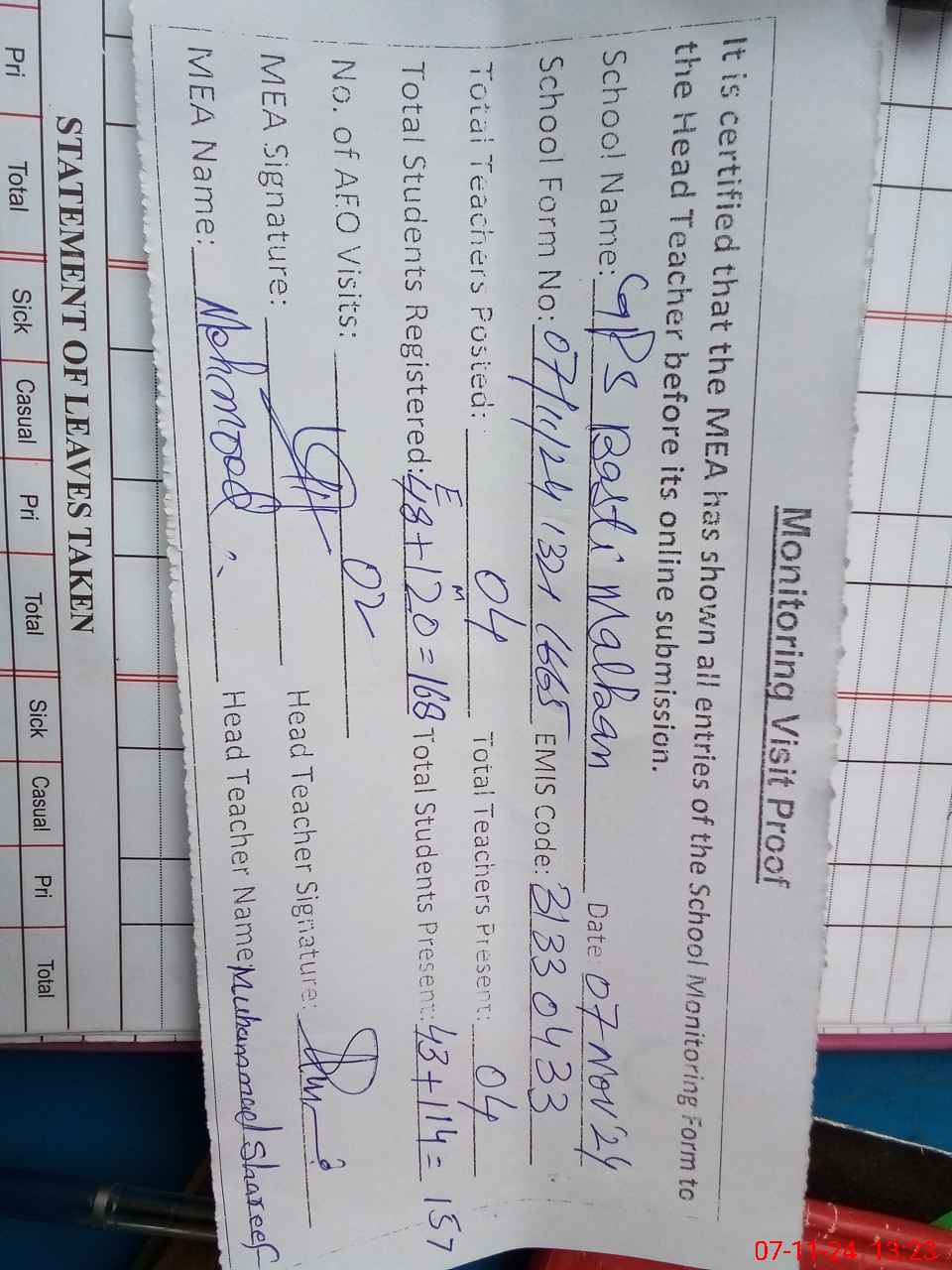 | Attendance Register | Head Teacher | MEA with School | Visit Proof |