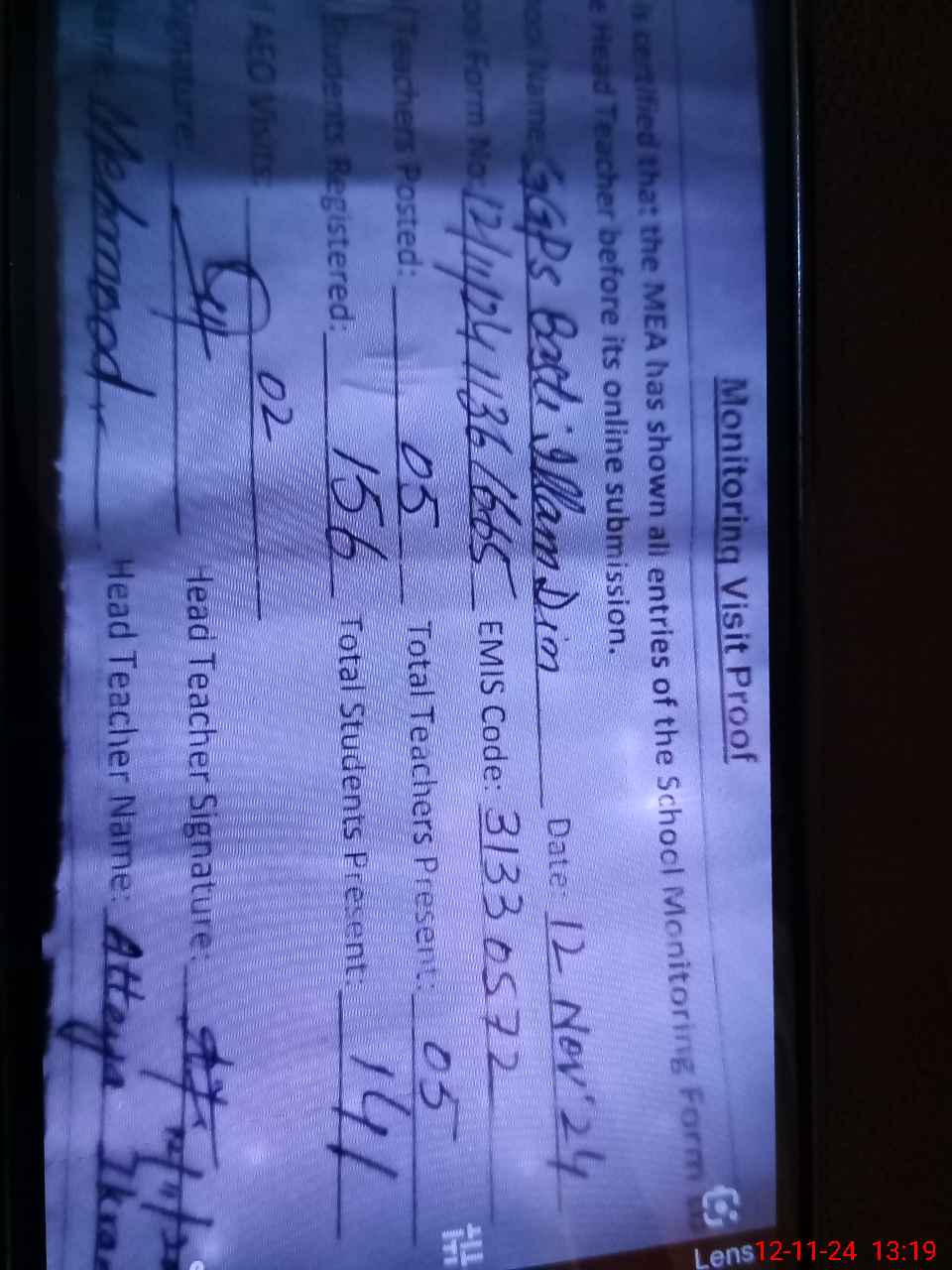 | Monitoring Date: 12-11-2024 | Start Time: 12-11-2024 12:39 PM | End Time: 12-11-2024 01:20 PM | Name of MEA: Ma**** UlHa**** | |