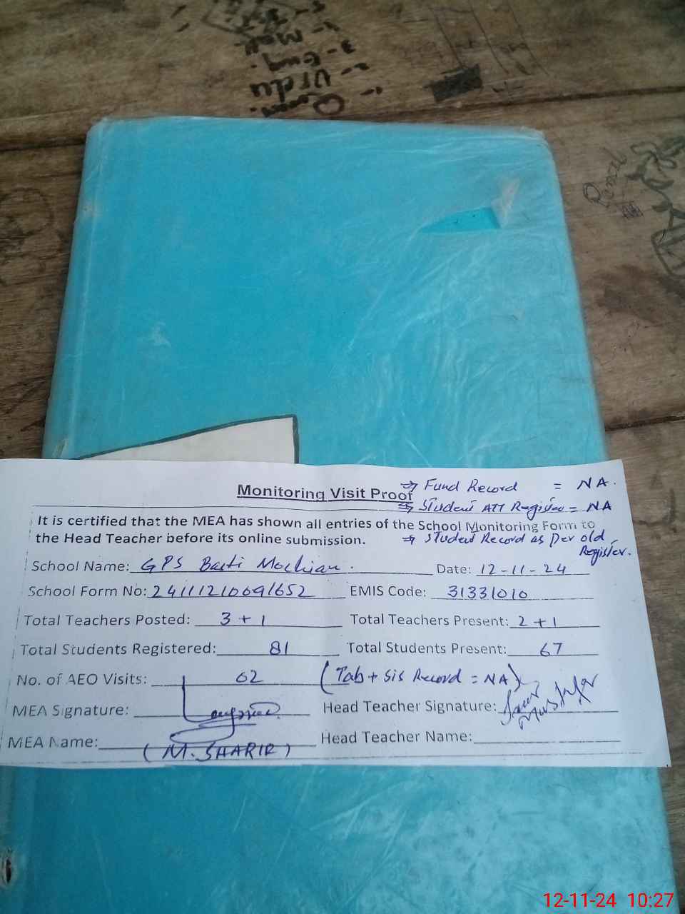 | Attendance Register | Head Teacher | MEA with School | Visit Proof |