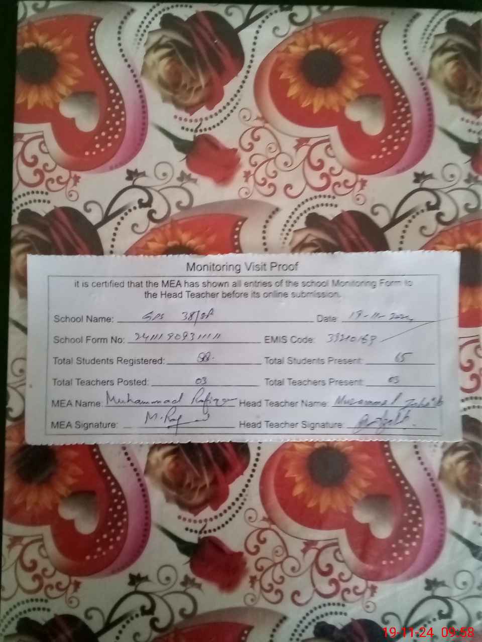 | Attendance Register | Head Teacher | MEA with School | Visit Proof |