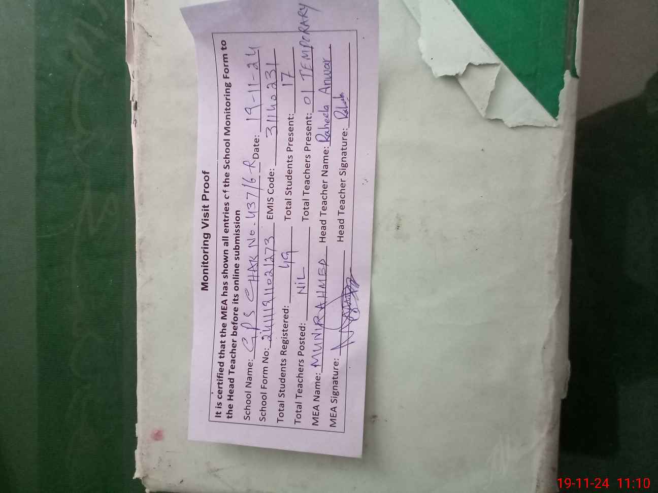 | Attendance Register | Head Teacher | MEA with School | Visit Proof |