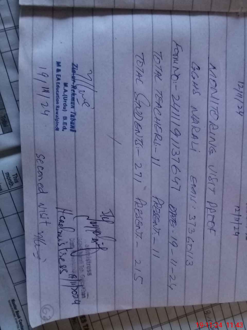 | Remarks (Use Separate Page if Required): I had already visited this school on 12 Nov 2024 but due to location error inspection not saved even multiple try hence restarted tab data entered but same reply on data submission today I am monitoring once again with the permission of DMO office Rwp I have pictorial evedance of my first visit | |||||