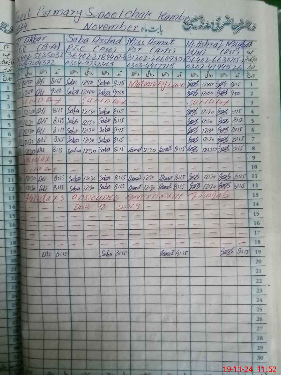 | CNIC | Full Name | Designation | R/C | Absence During Last Calender Month |