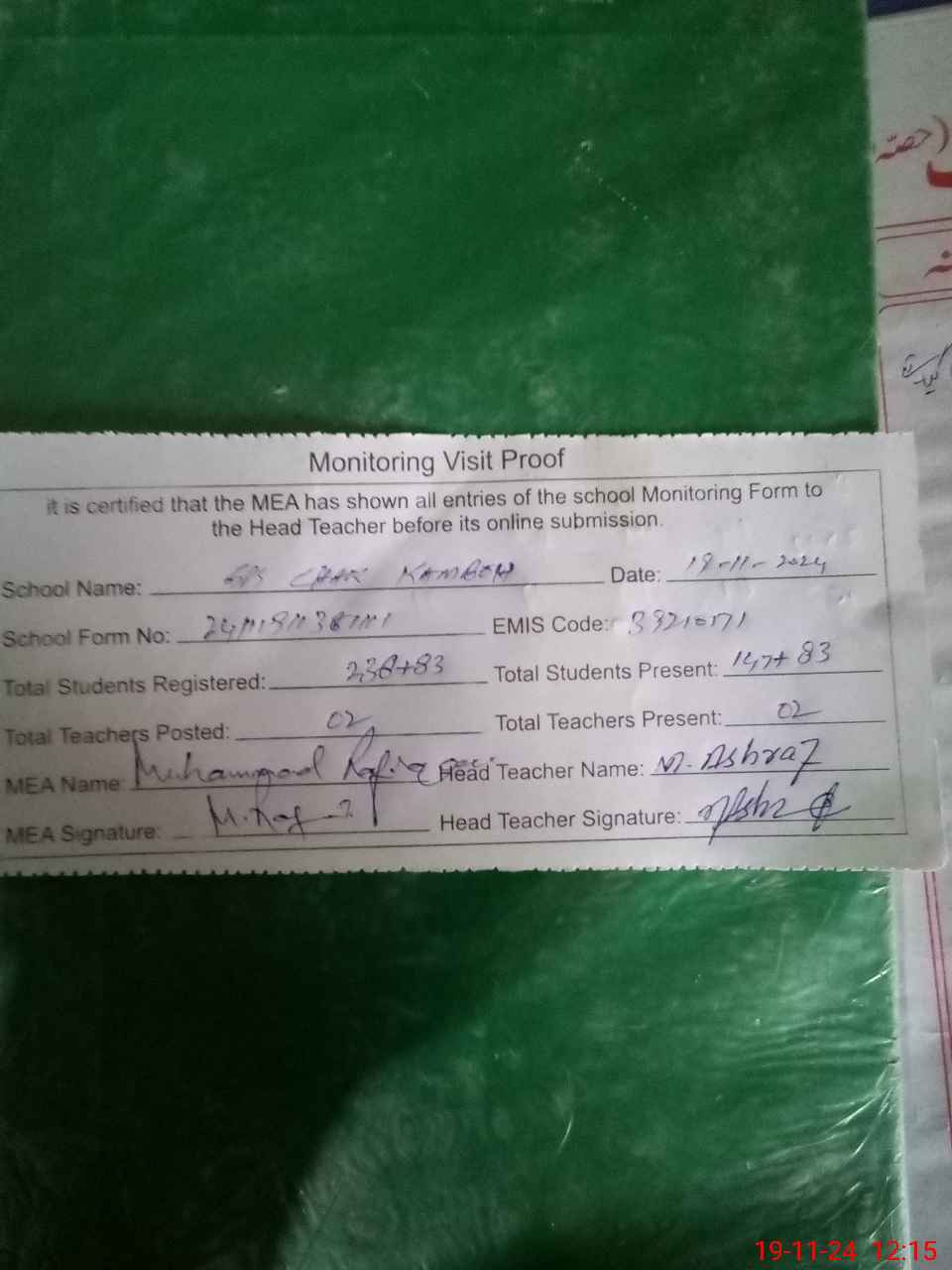 | Attendance Register | Head Teacher | MEA with School | Visit Proof |