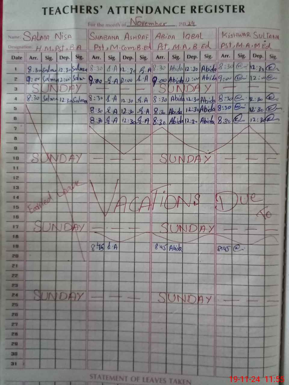| 33**** | Sa**** Ni**** | PST | Regular | 2 | 0 | 0 | 0 | 0 | 0 | 0 | 0 | 2 | Absent (Un-Authorized) |