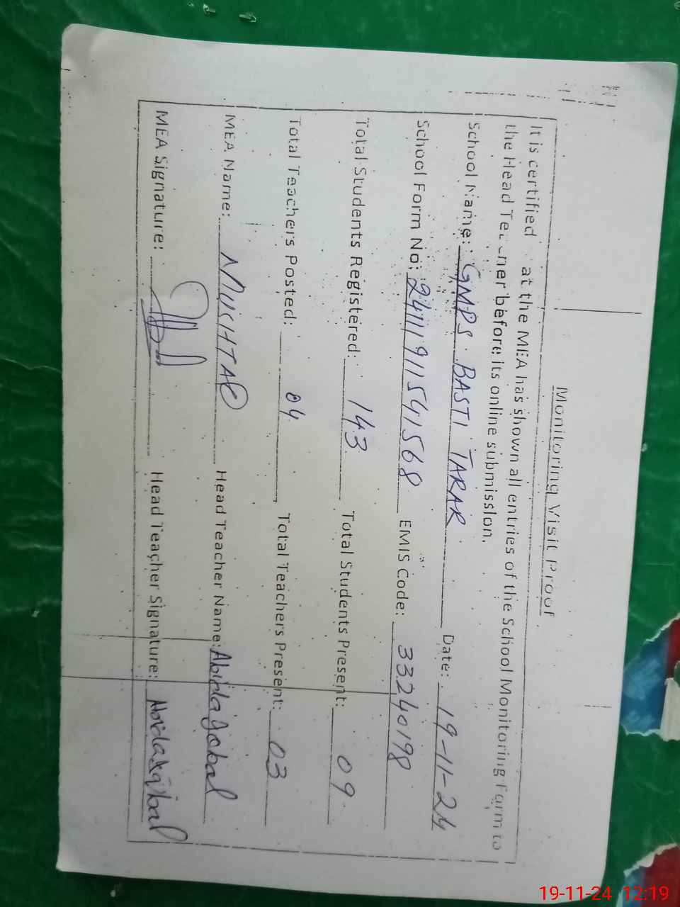| Attendance Register | Head Teacher | MEA with School | Visit Proof |
