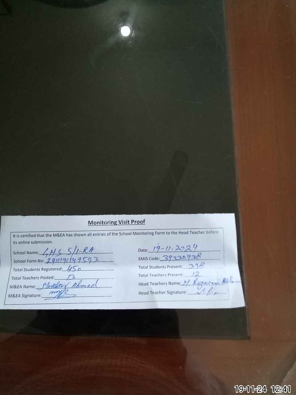 | Attendance Register | Head Teacher | MEA with School | Visit Proof |