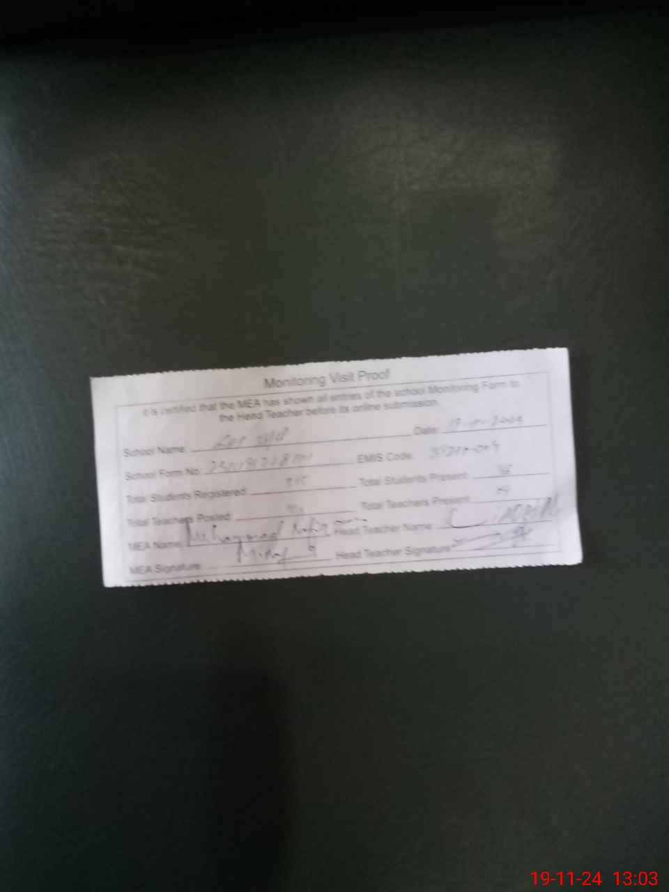 | Attendance Register | Head Teacher | MEA with School | Visit Proof |